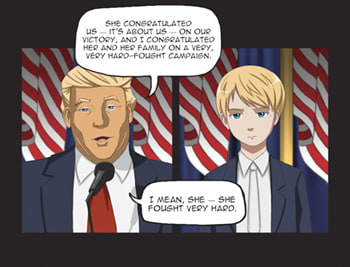 To all the non-otaku out there, TAOBAHLMPF (created by Brooklyn-based artist Joy Ling) sees Barron, who really just wants to “watch Netflix and play Pokemon,” teaming with Sasha and Malia Obama to solve the puzzle surrounding a “mysterious anomaly” that appeared after his father took office — which is not a polite way to refer to Kellyanne Conway. We don’t want to give away too many spoilers, but one of the central conflicts revolves around Barron trying to persuade his father to help put things right. Oh, that’s right, Donald Jerwillickers Trump makes an appearance, or at least the DJT from the universe where he doesn’t believe that exercise is a liberal plot to sap his precious bodily fluids.