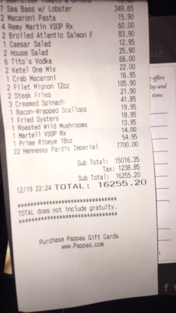 On Monday, that rookie was Houston Texans safety KJ Dillon who was handed a $16,255.20 bill for dinner with teammates. Included was $349.65 in sea bass and a whopping $7,770 of Hennessy Pardis Imperial. Not included was the gratuity, which should have been about $3,200 if Dillon was being only mildly generous. Buried deep in the check was a $12.95 Caesar salad that was apparently all Dillon ate according to his Twitter feed, where he placed a photograph of the bill and informed his followers that he didnt even partake in the $7,770 of Hennessy since he doesnt even drink.